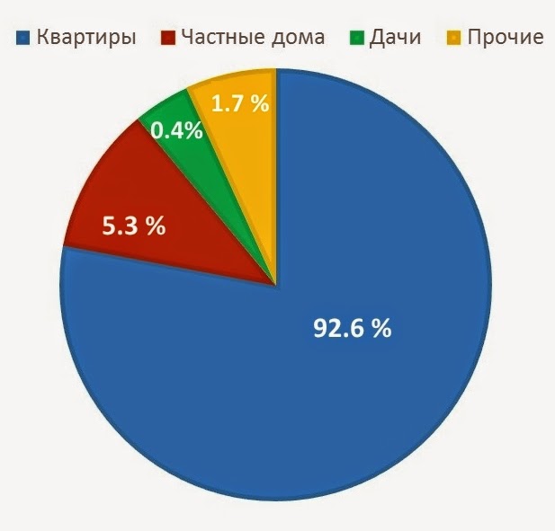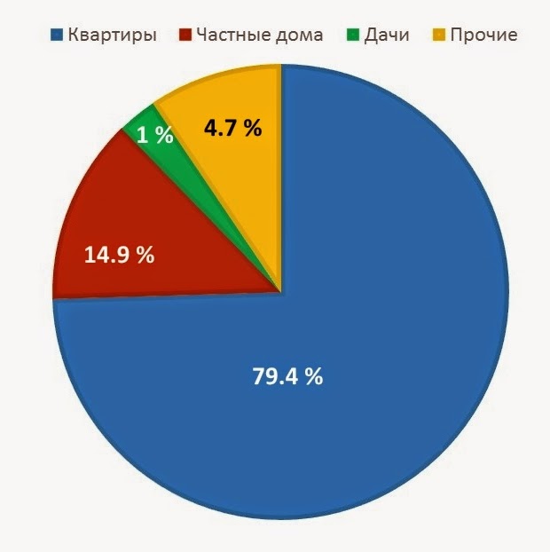 Квартиры - 79.4%, дачи - 1 %, частные дома - 14.9%, прочие - 4.7%.